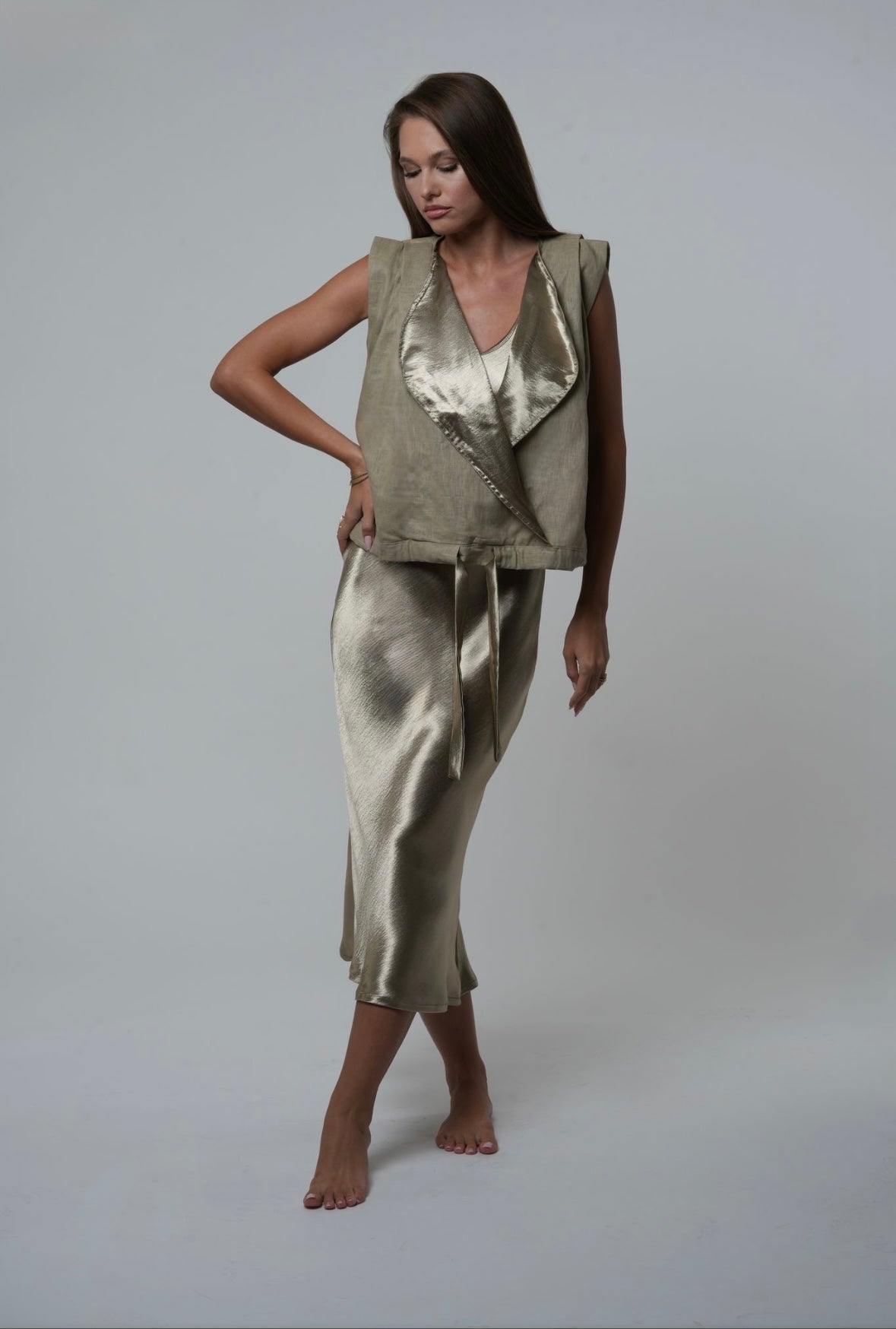 SATIN DRESS X LINEN JUMPER in metallic sage